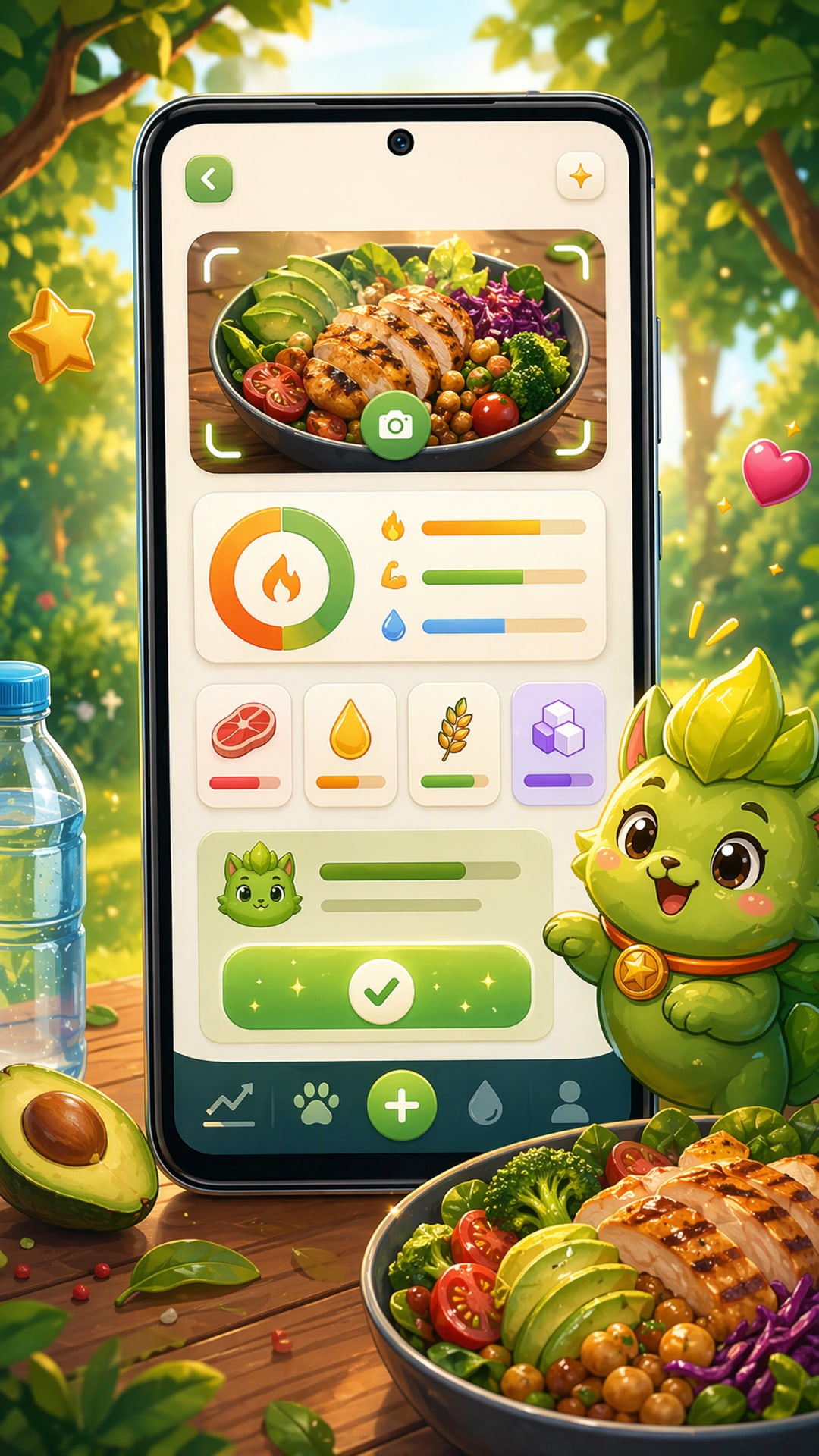 It is a habit loop: a pet and tasks help users keep logging meals beyond the first few days. The app shows both numbers and visible progress.